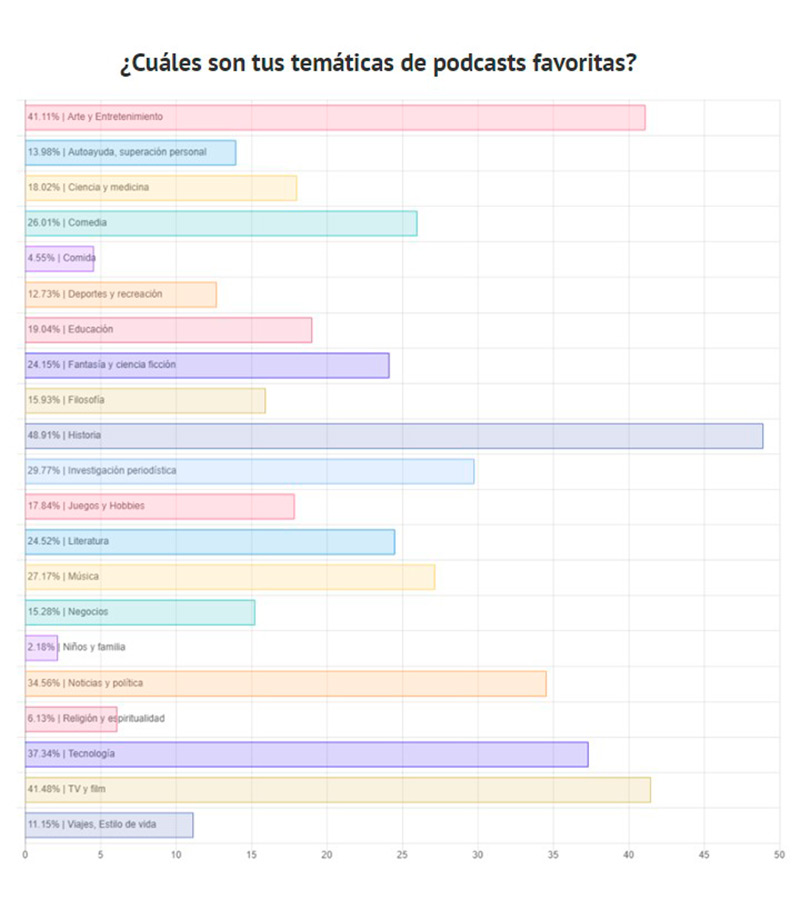 - Entretenimiento y aprendizaje son las principales razones para escuchar podcast. Y las temáticas preferidas son Historia, TV y cine, Arte y entretenimiento y Tecnología.
