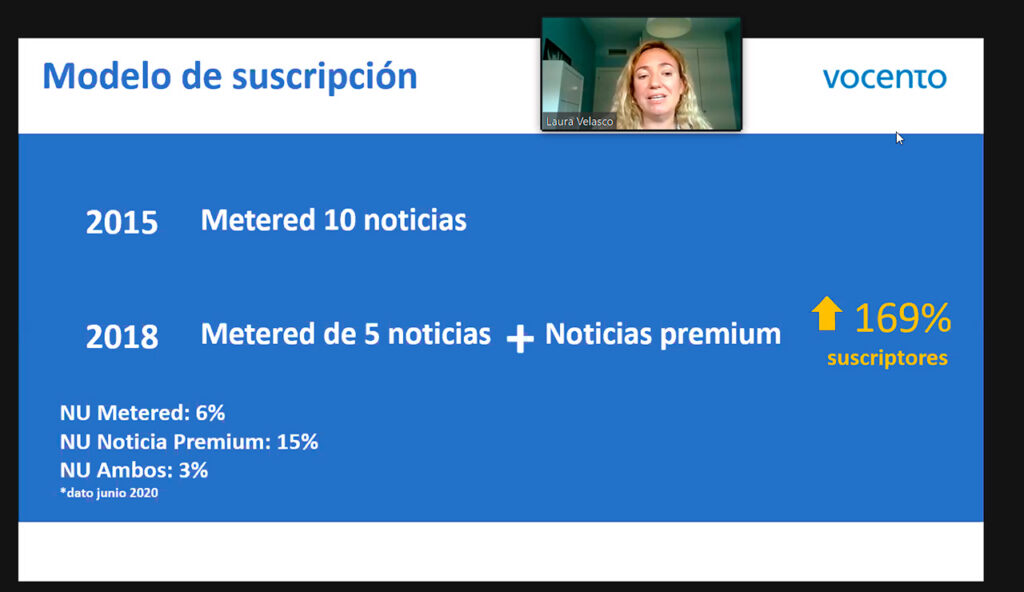 Laura Velasco ha hecho especial hincapié en que uno de los hitos que había permitido al grupo Vocento crecer en número de suscriptores fue el cambio de un modelo metered puro a uno híbrido. En el año 2015 Vocento empezó la puesta en marcha de muros de pago en alguno de sus periódicos regionales y poco a poco ha ido expandiéndolo al resto de medios, en un proceso que continua aún.