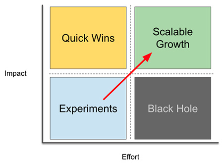 Quick wins (victorias rápidas). Hacer cambios de bajo esfuerzo con un impacto potencialmente alto «es una excelente manera de generar impulso y confianza. Este mecanismo de clasificación nos ayudó a movernos rápido, y el tiempo era esencial.