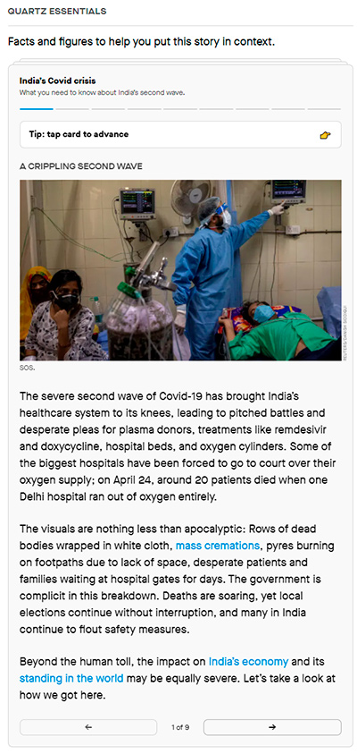 El artículo ofrece información esencial que ayudan al lector a ubicar esa noticia en particular dentro del contexto más amplio de la crisis del coronavirus en India. Luego, gracias a Quartz Essentials, el lector puede tener una visión más global sobre el ascenso del comercio electrónico impulsado por la pandemia.