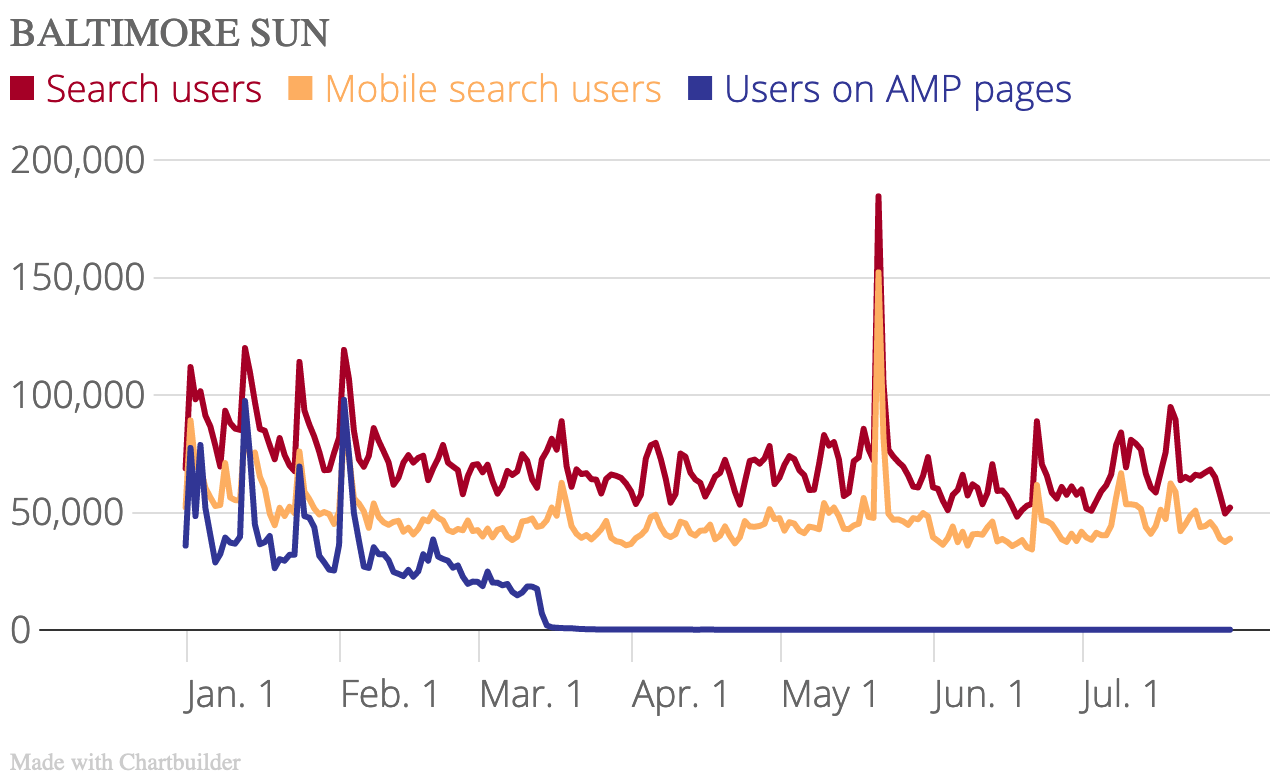 El primer periódico en el que se eliminó AMP fue el Baltimore Sun, a principios de marzo pasado. Antes del cambio, alrededor del 68 % de los usuarios de búsqueda móvil diarios que llegaban a Sun accedían a AMP.