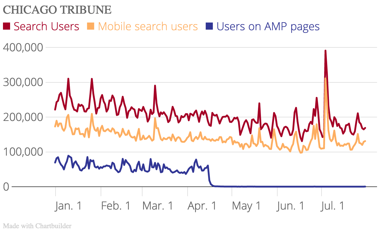 Posteriormente se deshabilitó AMP en el Chicago Tribune. Según el grupo editor, «Chicago Tribune también demostró ser extremadamente resistente, con una disminución del 18,15 % en la media diaria de usuarios de búsquedas móviles que publican AMP, principalmente debido a la disminución general de las búsquedas».