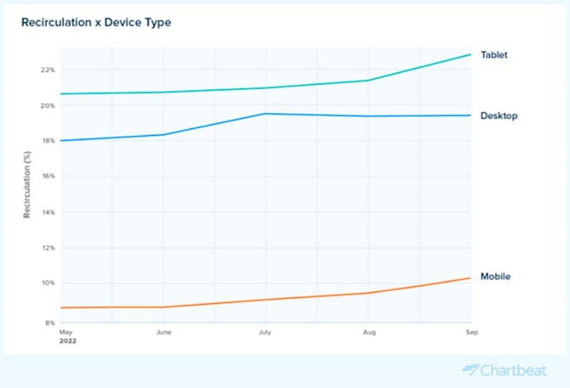 En el período comprendido entre mayo y septiembre de 2022, Arte y Entretenimiento tuvo la tasa de recirculación más baja con un 9,8%, y Finanzas tuvo la mayor tasa con un 16,8 %. Deportes, y Noticias y Medios estuvieron en el medio con un 12,8% y 11%, respectivamente, según las cifras de Chartbeat.