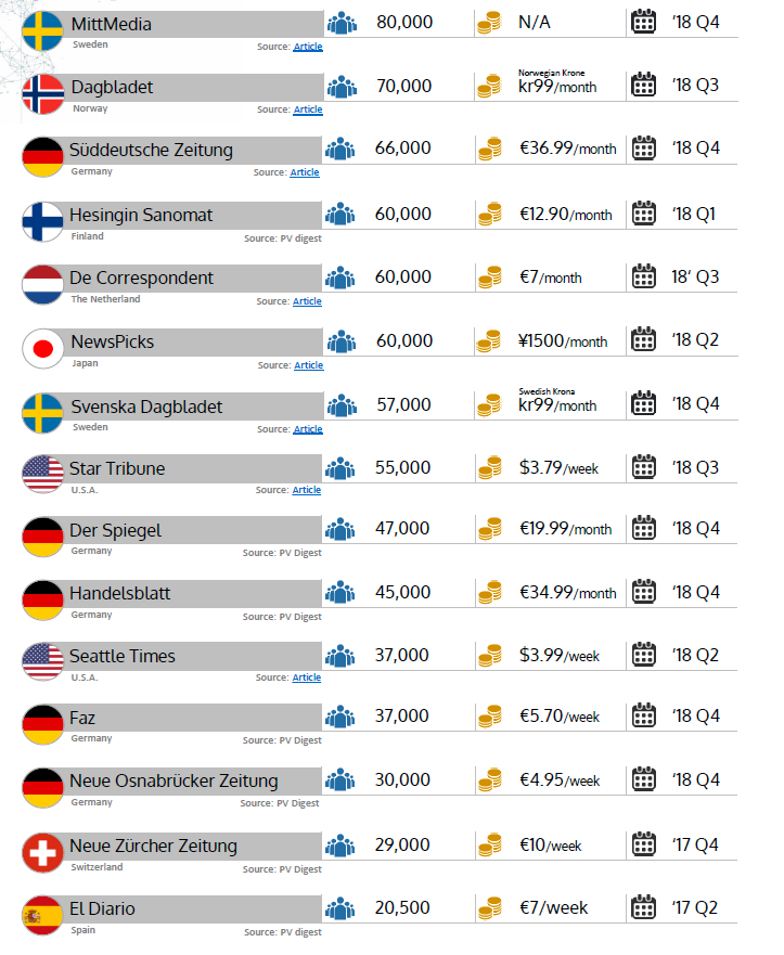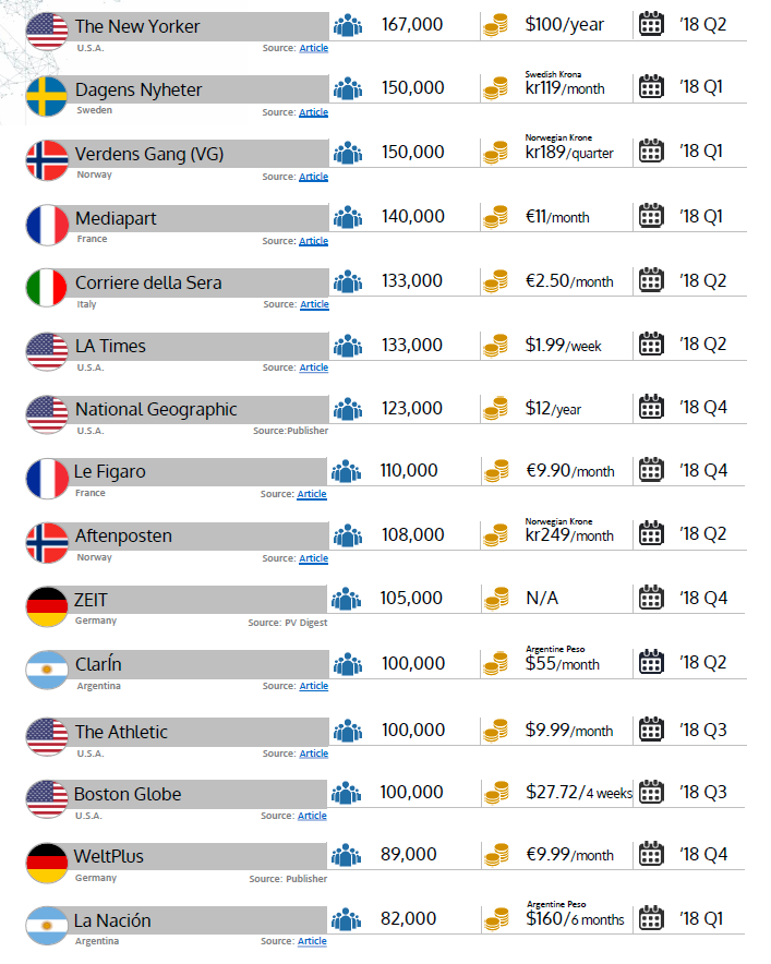 El primer puesto en cuanto a número de suscriptores digitales de pago lo ocupa The New York Times, seguido de The Wall Street Journal, Washington Post y Financial Times. Esta es la lista de los periódicos por volumen de suscriptores. La segunda columna hace referencia al precio y la última, la fecha de actualización de los datos para cada medio.