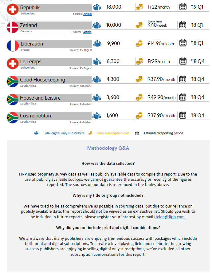 Sólo un periódico español, en este caso Eldiario.es, aparece en la lista anual de medios ordenada por suscriptores que publica la Federación Internacional de la Prensa Periódica (FIPP). Eldiario.es ocupa la posición 45, con 20.500 usuarios, aunque los datos que recoge la FIPP son de 2017 y en este caso no reflejan la realidad actual del medio, que si bien empezó 2018 con 22.800 suscriptores, el año pasado cerró ya con una cifra de socios por encima de los 32.000 declarados, y en este momento está en torno a 34.000. Aunque es una lista exhaustiva, se basa en datos públicos, con lo que algunos medios no aparecen, explica la FIPP, porque no han tenido acceso a esos datos.