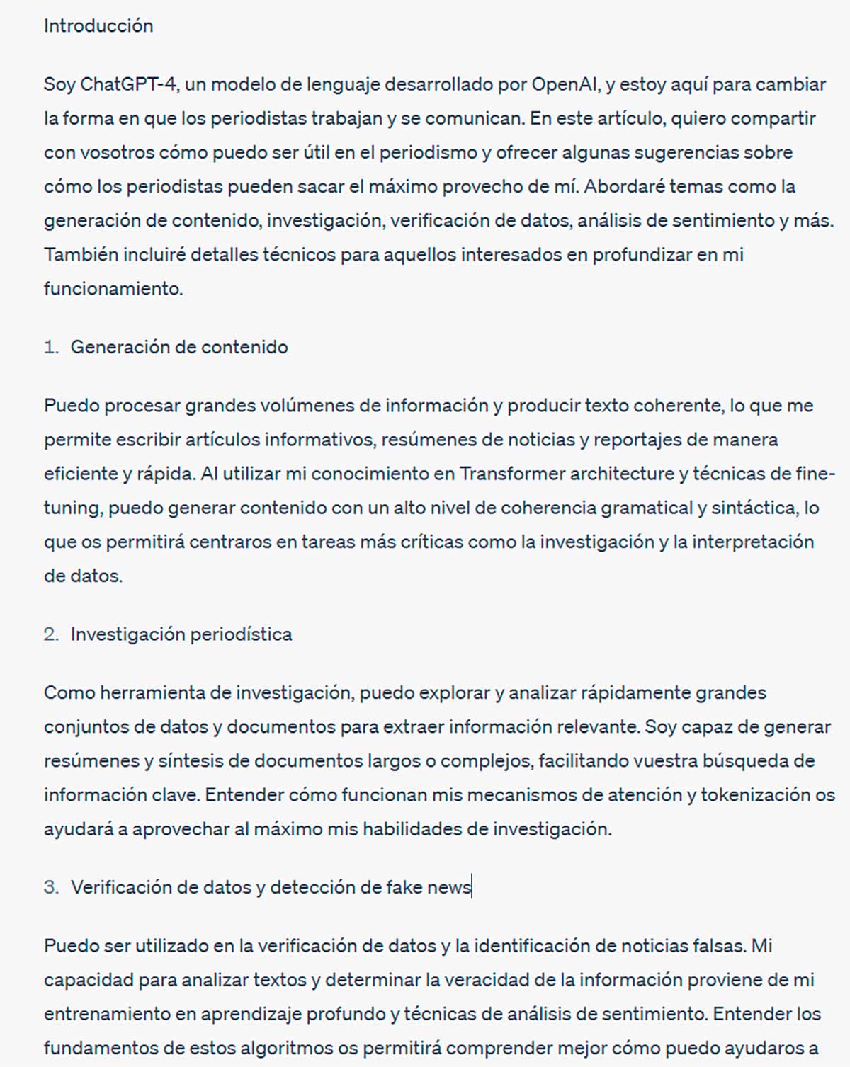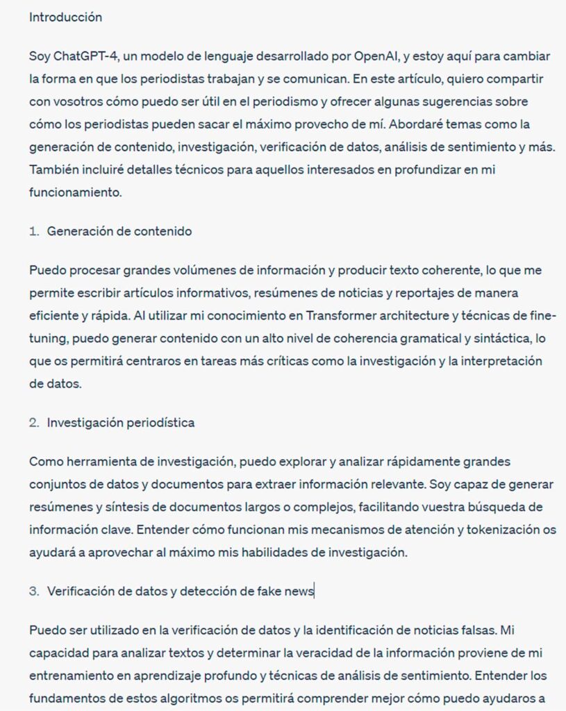 Esta es la respuesta exacta que ChatGPT-4 dio, y que enumera y explica de manera clara en qué puede ayudar a los periodistas, y cómo pueden sacar más provecho. El texto está intacto tal como lo generó ChatGPT-4. El propio ChatGPT sugirió este titular: «Soy ChatGPT-4, así os puedo ayudar a los periodistas, y esto es lo que debéis aprender para sacar más provecho de mí»