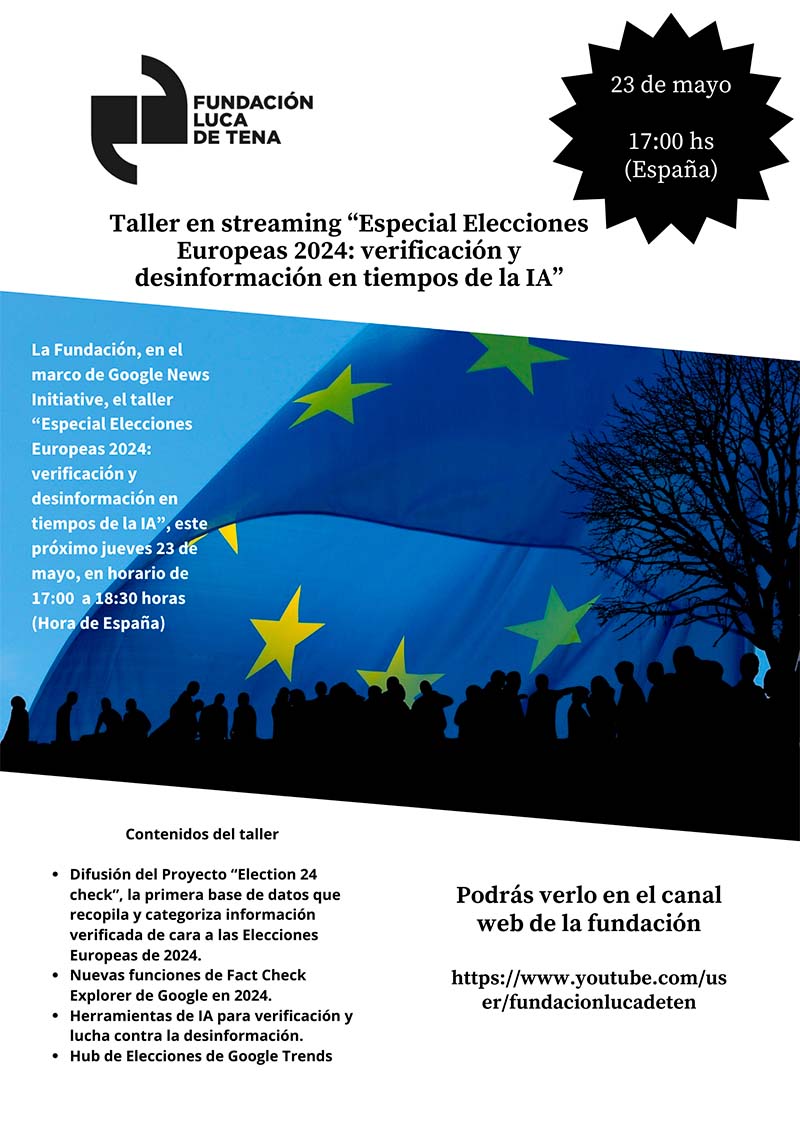 La Fundación Luca de Tena, tras el éxito de la formación junto a la Asociación de la Prensa de Madrid (APM) lanza, en el marco de Google News Initiative, el taller “Especial Elecciones Europeas 2024: verificación y desinformación en tiempos de la IA”, este próximo jueves 23 de mayo, en horario de 17:00 a 18:30 horas (Hora de España)