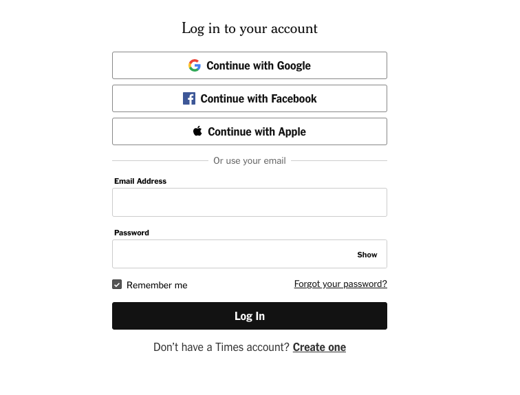 Los elementos del componente de inicio de sesión y registro, que es la forma en que los usuarios acceden a sus suscripciones de Times, son visualmente distintos.