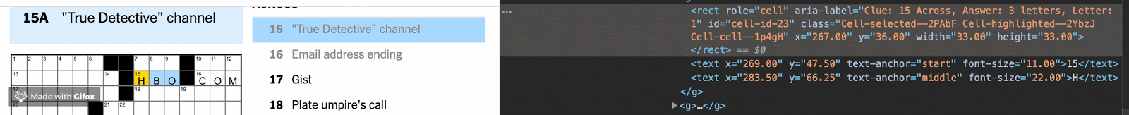 The New York Times ha implementado puntos de referencia ARIA en espacios como el crucigrama, en donde, por ejemplo, se utiliza la etiqueta SVG HTML <rect> para representar cada cuadrado del crucigrama. «Cuando un usuario se desplaza hacia cada cuadrado, los puntos de referencia de ARIA cambian dinámicamente para dar más contexto sobre su ubicación en la página. El lector de pantalla del usuario puede decirle a qué pista está respondiendo y la cantidad de letras necesarias para resolver la pista», explica Kumar.