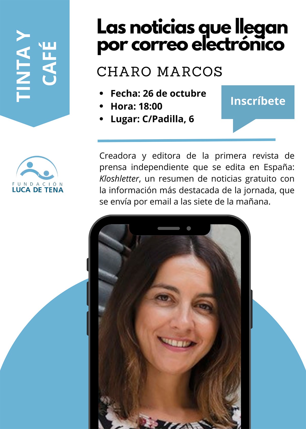 La Fundación Luca de Tena organiza su tertulia TINTA Y CAFÉ: Las noticias que llegan por correo electrónico, con Charo Marcos como invitada. Charo, creadora y editora de la primera revista de prensa independiente que se edita en España: Kloshletter, un resumen de noticias gratuito con la información más destacada de la jornada, enviada por email a las siete de la mañana, nos cuenta sus entresijos.