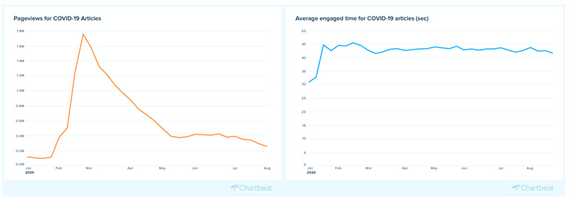 Uno de los casos que mejor ejemplifica este punto de aumento del compromiso a medida que madura el tema se comprueba nítidamente cuando se analizan las elecciones estadounidenses: el número de páginas vistas para el contenido relacionado con las elecciones de EEUU disminuyó en los Estados Unidos durante los primeros días de la propagación de la Covid-19 en América del Norte y se disparó a fines de agosto en la época de las convenciones demócratas y republicanas.
