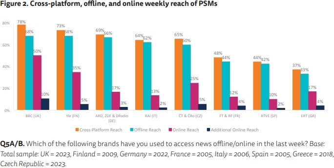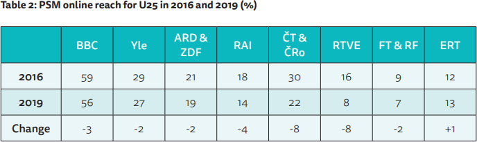 «La audiencia de los medios de comunicación públicos es de mayor edad, educada y políticamente diversa. Como resultado, los medios de comunicación públicos en muchos países están muy por debajo de la necesidad de proporcionar un servicio de noticias universal, especialmente online y corren el riesgo de volverse irrelevantes para gran parte del público. Los medios de comunicación públicos, a menudo tienen dificultades para llegar al público más joven y a las personas con educación formal limitada. La mayoría de estos medios son ampliamente utilizados y de gran confianza, pero a menudo son menos confiables por la gente de la derecha política y por personas con actitudes populistas».