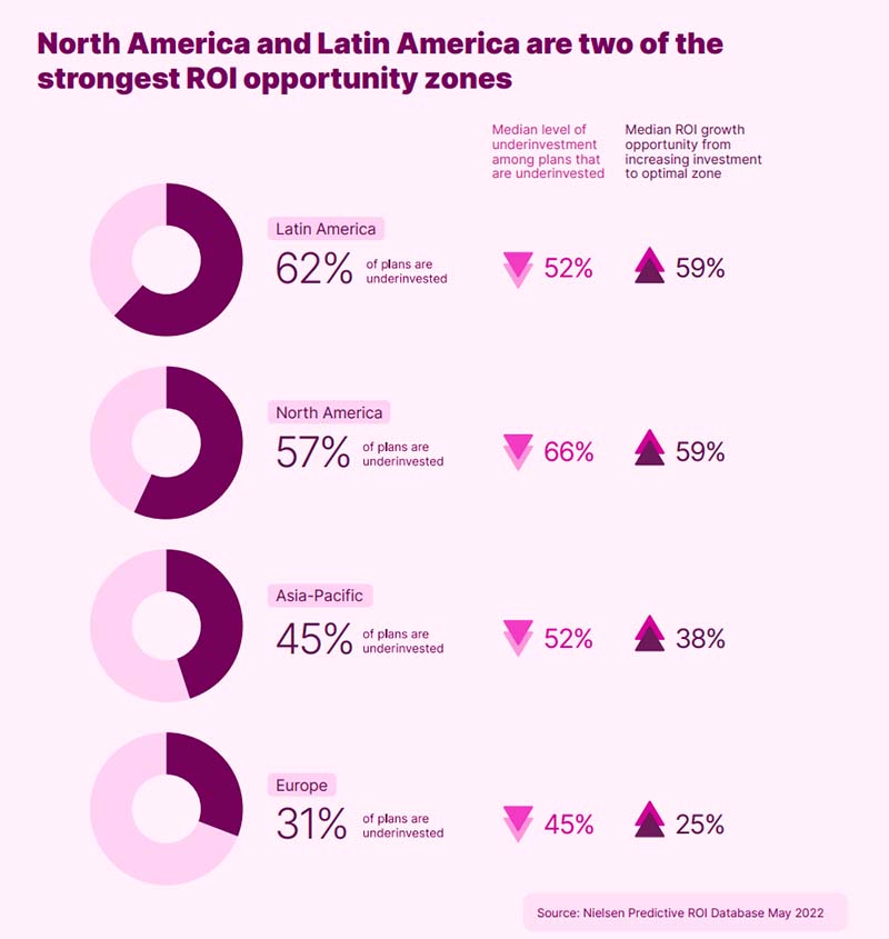 América Latina también tiene una gran oportunidad al respecto, si anunciantes y agencias comprenden la necesidad de que se mejore la ratio de inversión en medios. Más de la mitad de los planes analizados en América Latina muestra una inversión insuficiente, y un ROI mucho mayor en el momento en que se corrige la infrainversión.