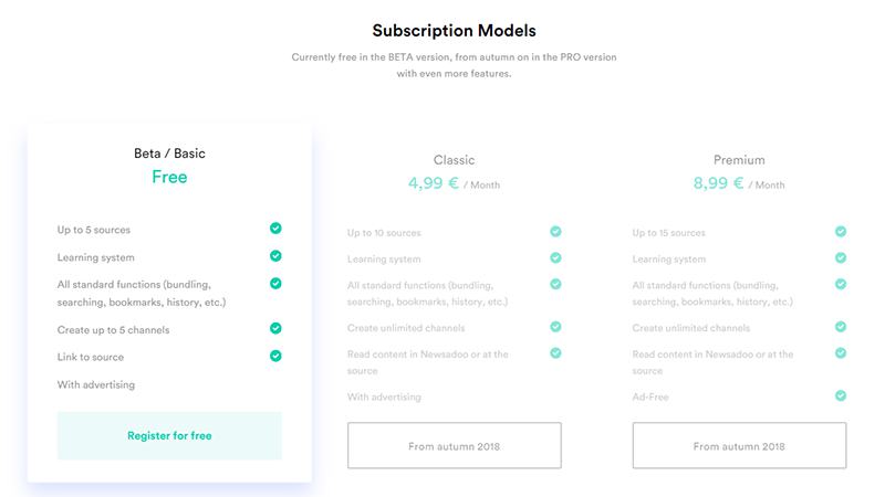 Una primera versión beta de Newsadoo está disponible de forma gratuita desde principios de junio de 2018, actualmente en una versión de escritorio y móvil, a la que seguirán en julio la aplicación iOS y Android y una versión Alexa Skill.