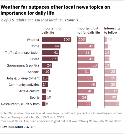 Quizás la función más básica del periodismo local es brindar a los residentes noticias sobre una variedad de temas de una manera que les ayude a vivir sus vidas diarias y participar en la comunidad. La elección de qué temas cubrir, cuándo y en qué medida, puede ser desalentadora, especialmente en medio de las luchas financieras de la industria. Los hallazgos muestran que los estadounidenses tienen una amplia gama de intereses, pero la mayoría ve solo unos pocos temas como importantes para su vida diaria.