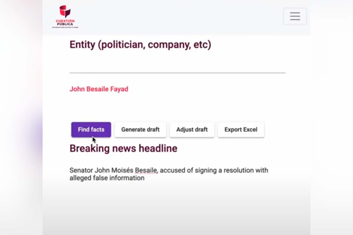 Este proyecto pasó de la idea al prototipado e implementación a partir de la participación de Cuestión Pública en el Artificial Intelligence Journalism Challenge (AIJC), una competencia global, tipo Silicon Valley, desarrollada por la Open Society Foundation que ofrecía formación, mentoría y financiamiento a las redacciones seleccionadas para desarrollar formas innovadoras de aplicar inteligencia artificial en el periodismo. Este programa se llevó a cabo en el segundo semestre de 2023.