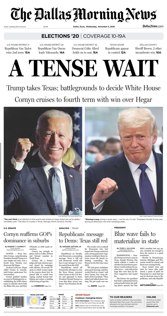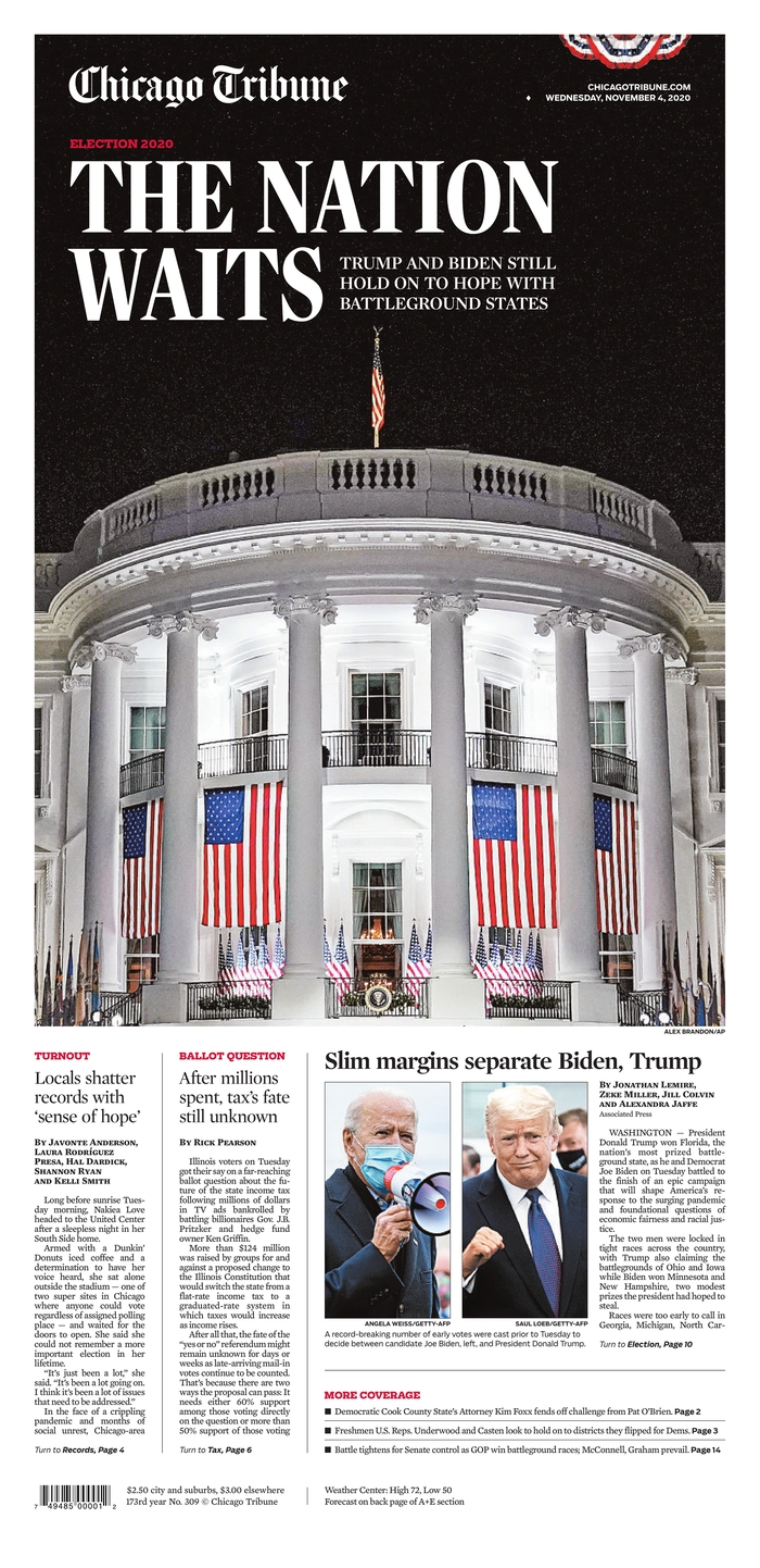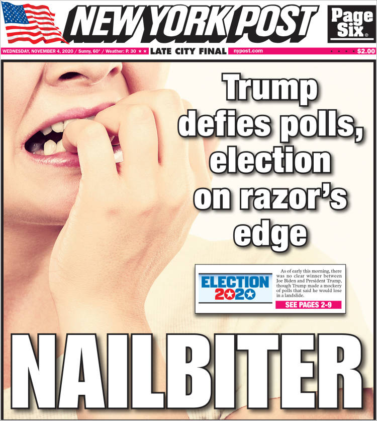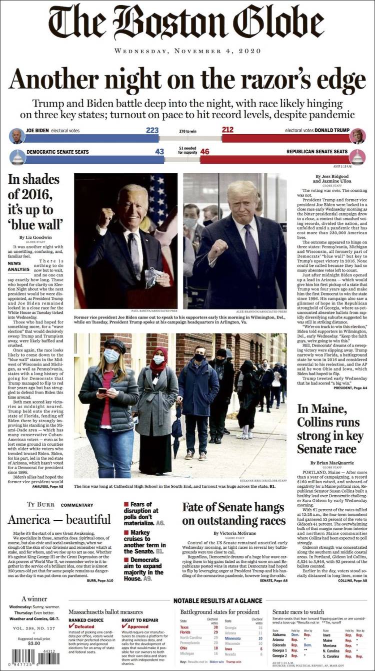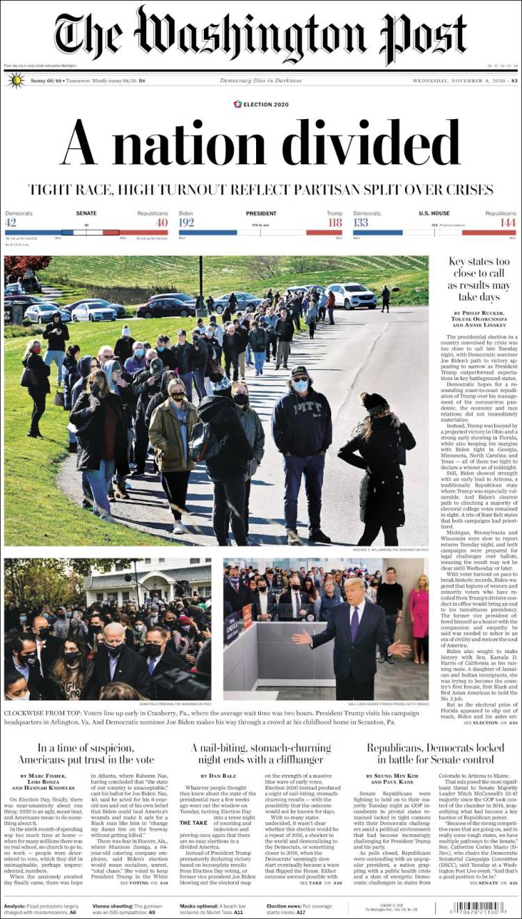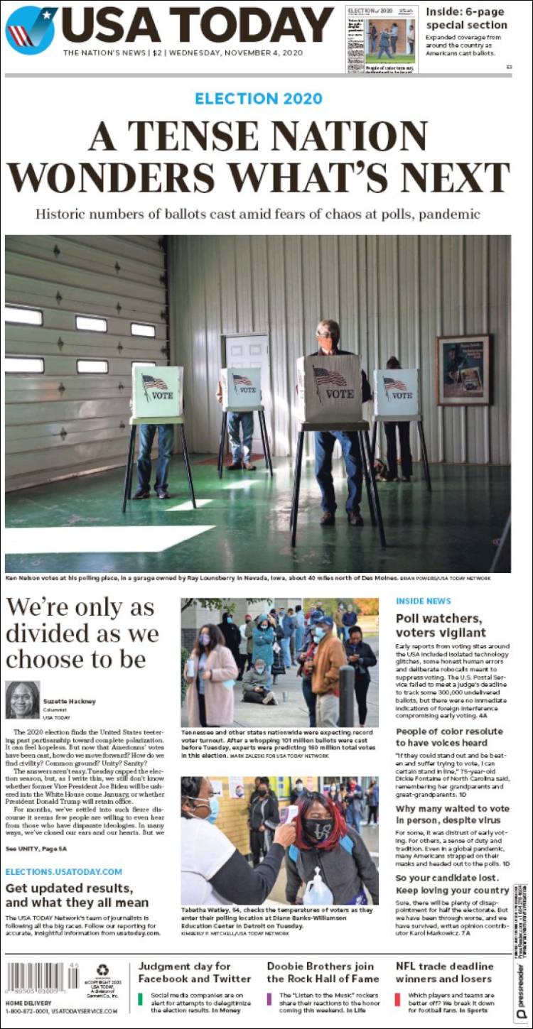Las noches electorales son uno de los momentos en que los periódicos más recursos destinan para cubrir con garantías la información, que queda resumida y plasmada en la portada, en algunos casos muy trabajadas. A continuación, por su interés, reproducimos las portadas de algunos de los periódicos más destacados de EEUU de hoy, 4 de noviembre, tras la noche electoral, en las que coinciden muchas de ellas en dos conclusiones: una nación dividida y tensa espera.