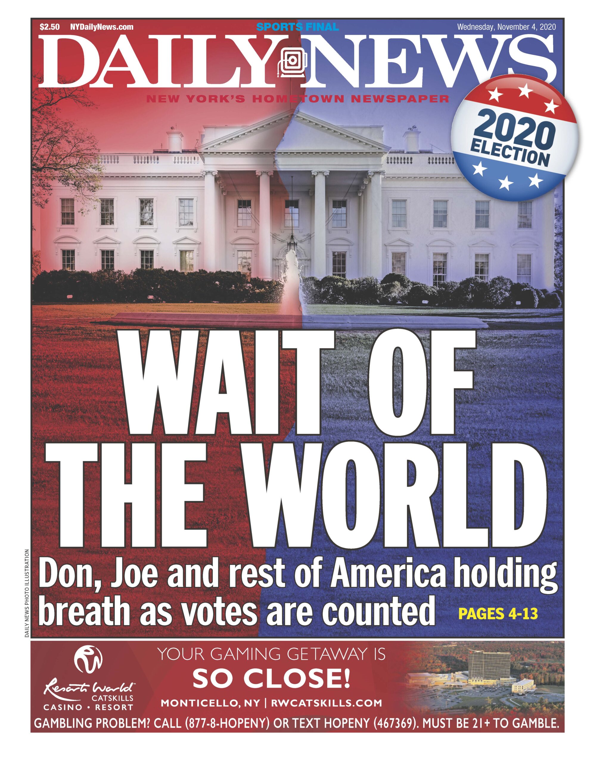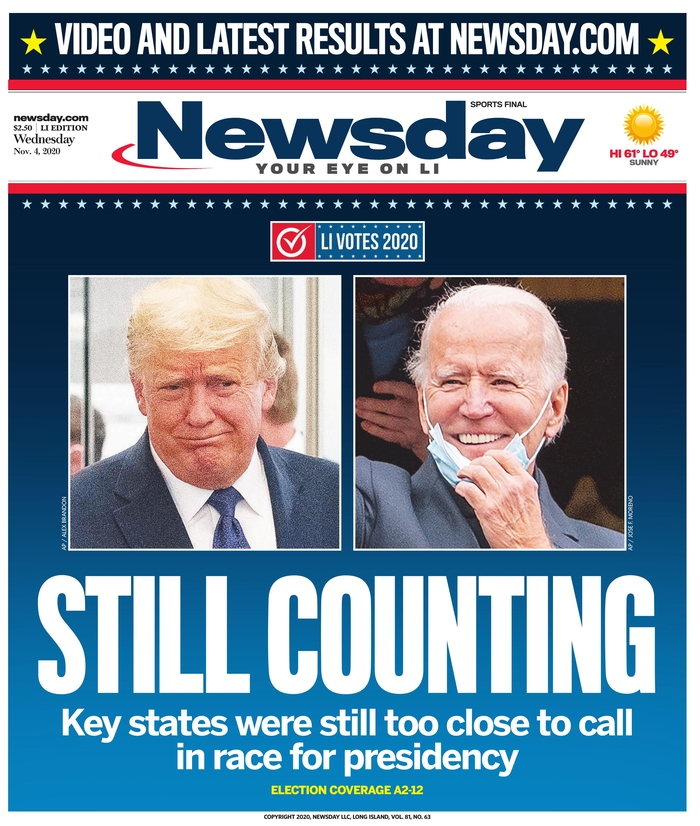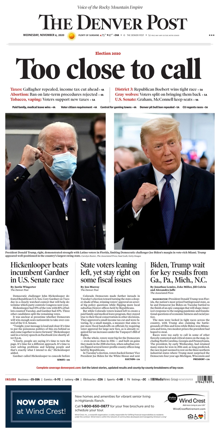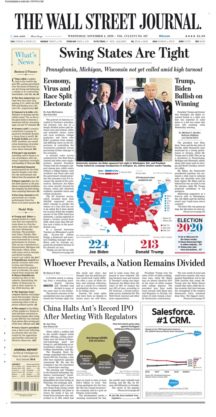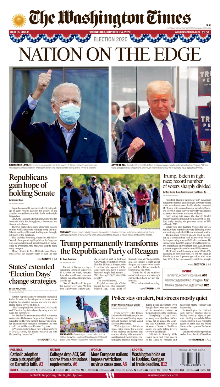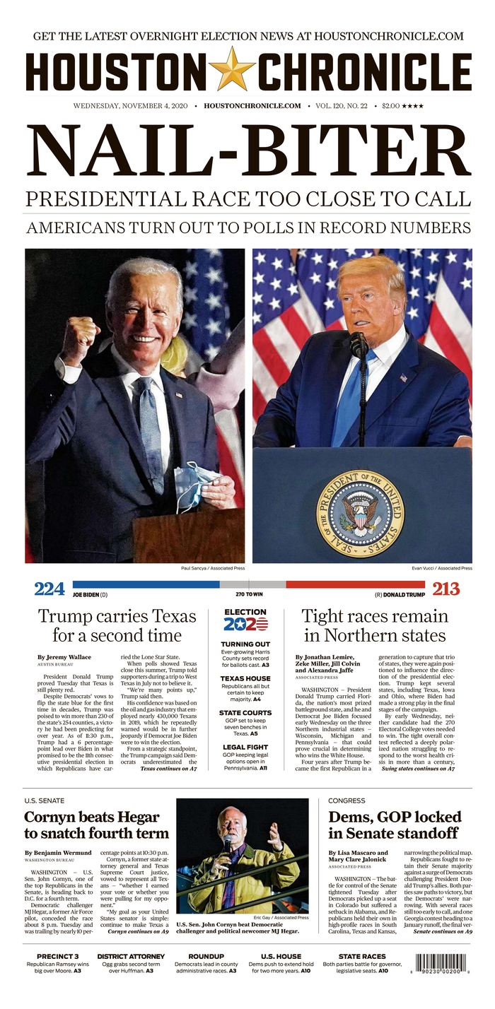 Las noches electorales son uno de los momentos en que los periódicos más recursos destinan para cubrir con garantías la información, que queda resumida y plasmada en la portada, en algunos casos muy trabajadas. A continuación, por su interés, reproducimos las portadas de algunos de los periódicos más destacados de EEUU de hoy, 4 de noviembre, tras la noche electoral, en las que coinciden muchas de ellas en dos conclusiones: una nación dividida y tensa espera.