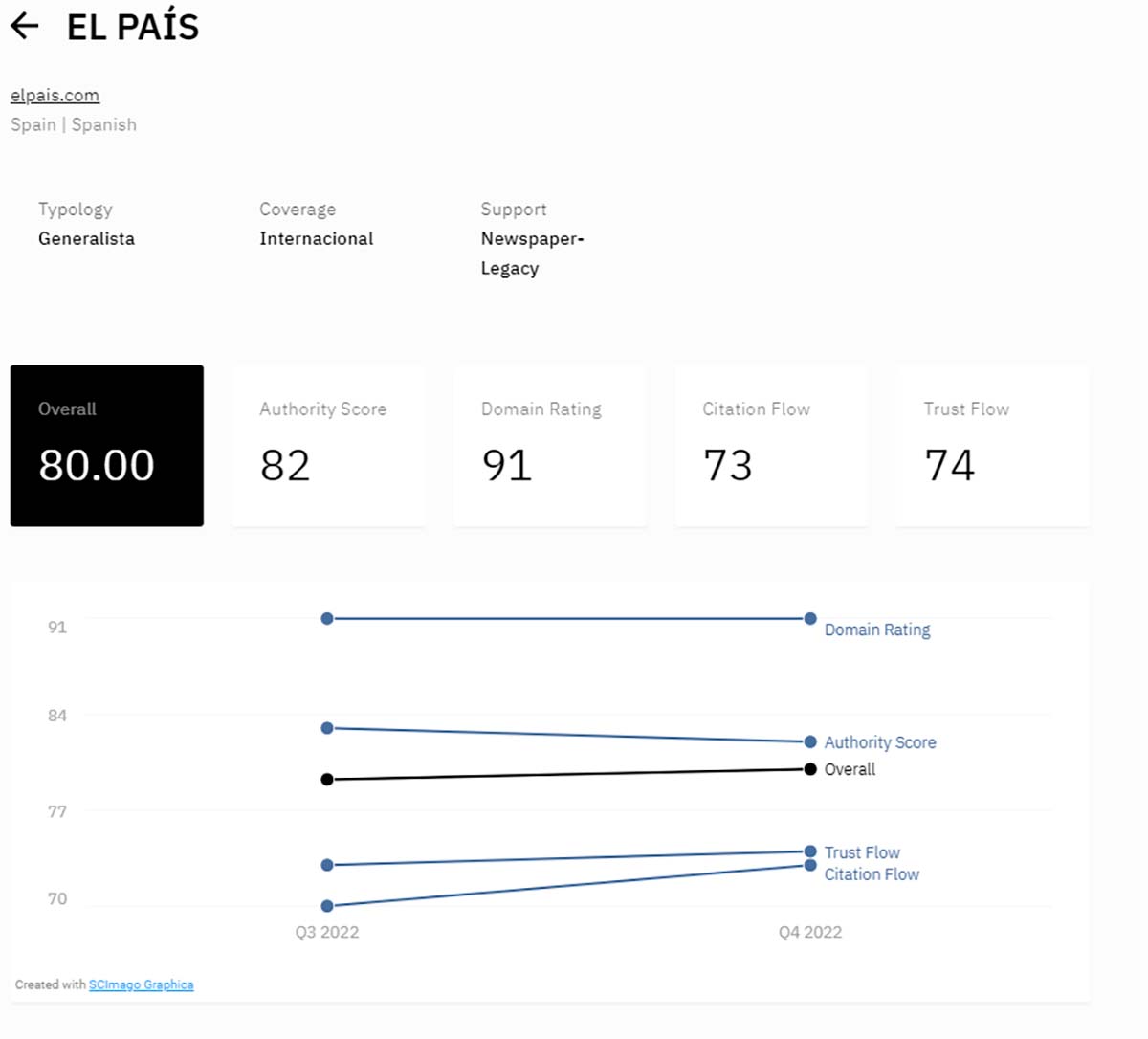El ranking permite individualizar cada medio y ver las puntuaciones obtenidas en cada apartado que se ha valorado: authority score, Domain rating, citation flow y trust flow. Por ejemplo, El País ha obtenido una autoridad de 82 puntos y 91 de rating de dominio, y puntuaciones más bajas en los otros dos campos.