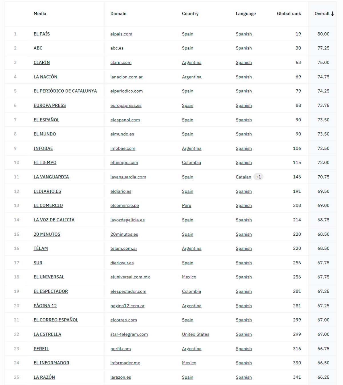 Con respecto a periódicos escritos en español, el ranking está liderado por El País (España), seguido de ABC (España), Clarín (Argentina), La Nación (Argentina), y El Periódico de Catalunya (España).