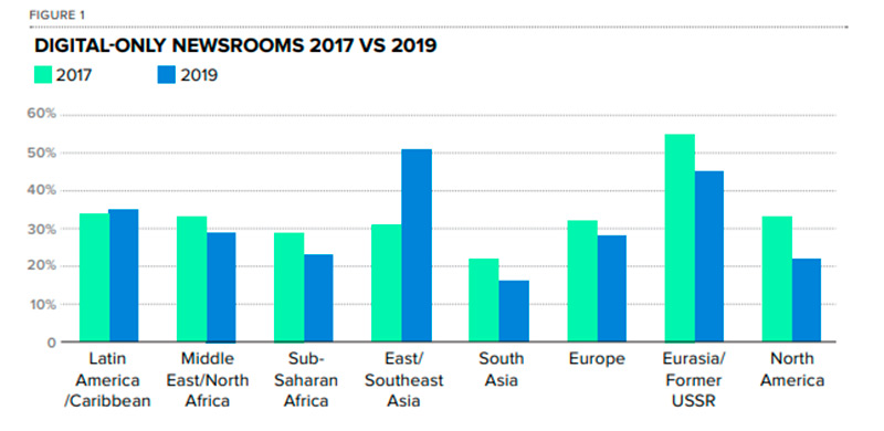 Crecimiento nulo de las redacciones sólo digitales. Sorprendentemente, el crecimiento digital en las redacciones es plano o ha disminuido en casi todas partes, lo que sugiere que son menos las nuevas empresas en marcha. En siete de las ocho regiones, el porcentaje de redacción solo digital ha disminuido o se ha mantenido estable desde 2017. La mayor disminución en las redacciones solo digitales ha sido en América del Norte (del 33% al 22%) y Eurasia (de 55% a 45%).
