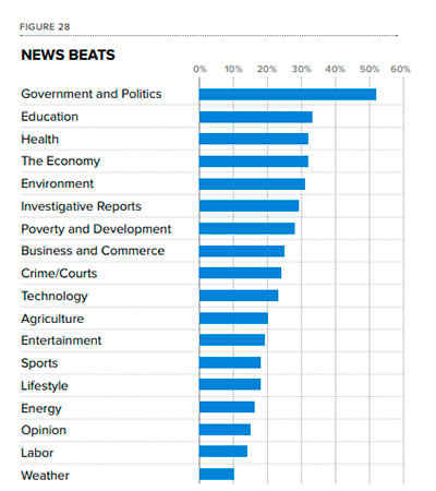 Más de la mitad de los periodistas de todo el mundo cubren la política y el gobierno, lo que lo convierte en el principal foco de noticias de la industria, seguido de la educación (33%), economía (32%) y salud (32%). Los periodistas norteamericanos son los menos propensos a informar sobre educación y economía. Los periodistas en Eurasia son los menos propensos a cubrir la política.