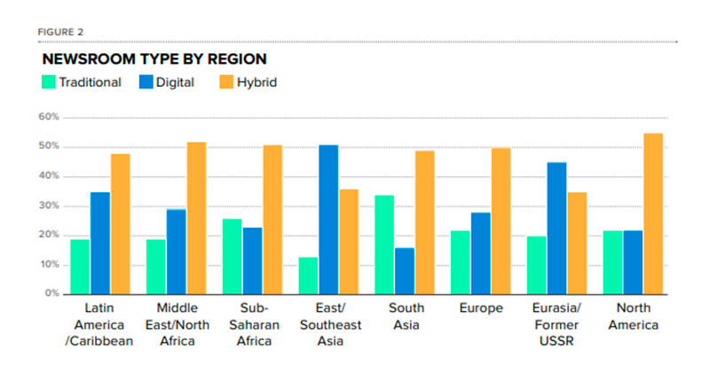 Más redacciones híbridas digital/papel. Las redacciones híbridas (con igual preocupación por lo digital que por lo escrito) están creciendo a medida que las redacciones tradicionales se reducen. De 2017 a 2019, el número de redacciones híbridas aumentó en todas las regiones estudiadas. Aproximadamente la mitad de las redacciones en seis de las ocho regiones son híbridas. Incluso en el sur de Asia, donde los medios tradicionales (aquellos que dependen de formatos heredados) reinaban hace solo dos años, las redacciones híbridas ahora dominan.