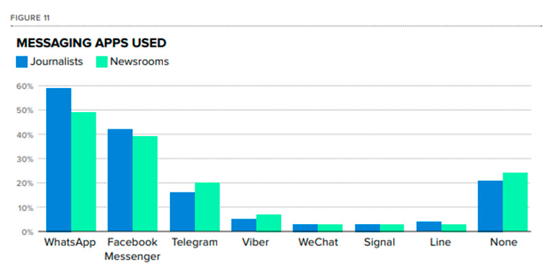 Crecen las apps de mensajería. El uso de aplicaciones de mensajería por parte de periodistas para atraer al público se ha disparado, incluso superando a Twitter. Más de dos tercios de los periodistas (69%) involucran a su público al menos semanalmente a través de mensajes instantáneos. Esto supera el 63% de los periodistas que usan Twitter y otros microblogs al menos semanalmente.