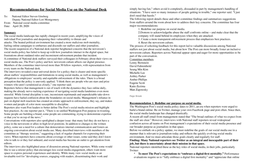 • Primero, mentalidad digital. Las evaluaciones de desempeño requieren que «adoptemos por completo una mentalidad digital antes que nada y «apreciemos que el objetivo y los lectores en línea son nuestro objetivo».  Los periodistas creen que esto requiere una presencia activa en las redes sociales, principalmente en Twitter, para promover los lectores en línea de The Post. Se reclama a los editores que aclaren si esa mentalidad digital como prioridad incluye la presencia continua en redes sociales o no.